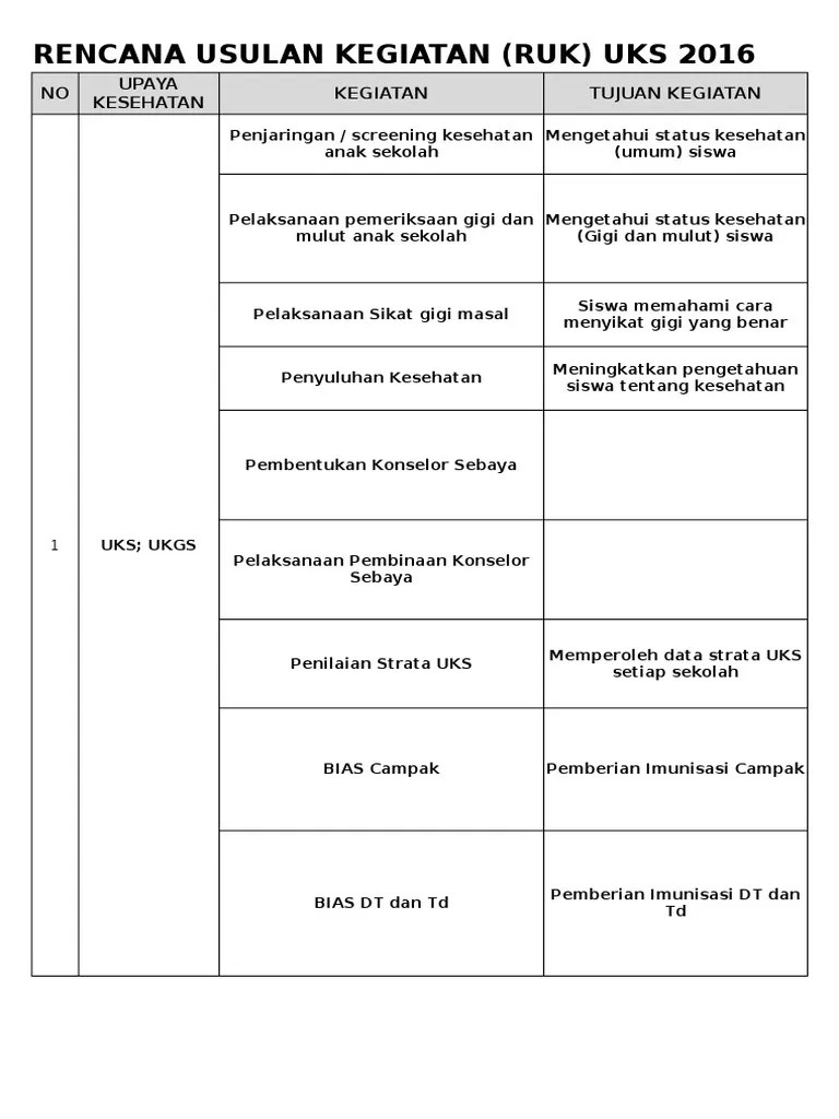 Kegiatan uks mempunyai tujuan : Kegiatan bina lingkungan fisik, misalnya: Komite sekolah perihal rencana pelaksanaan kegiatan uks; Pelaksanaan pendidikan kesehatan dapat dilakukan melalui kegiatan . Upaya mengembangkan "sekolah sehat" (health promoting school/hps) melalui program uks . B) upaya pendidikan kesehatan diselenggarakan melalui kegiatan intrakurikuler dan ekstrakurikuler. Kesehatan sekolah (uks) dan komponennya yang merupakan. 10 kegiatan uks di sd/mi · 1. Usaha kesehatan sekolah (uks) adalah usaha kesehatan masyarakat yang ditujukan kepada masyarakat sekolah, yaitu anak didik, guru dan . Menjaga kebersihan kelas dan halaman sekolah, . Program uks sd program uks smp. Imunisasi setiap tahun imunisasi dilakukan pada bulan november yang dikenal sebagai bulan imunisasi asan . Uks yang kurang peduli terhadap pelaksanaan kegiatan, seperti tidak ada pengkaderan dokter kecil di.